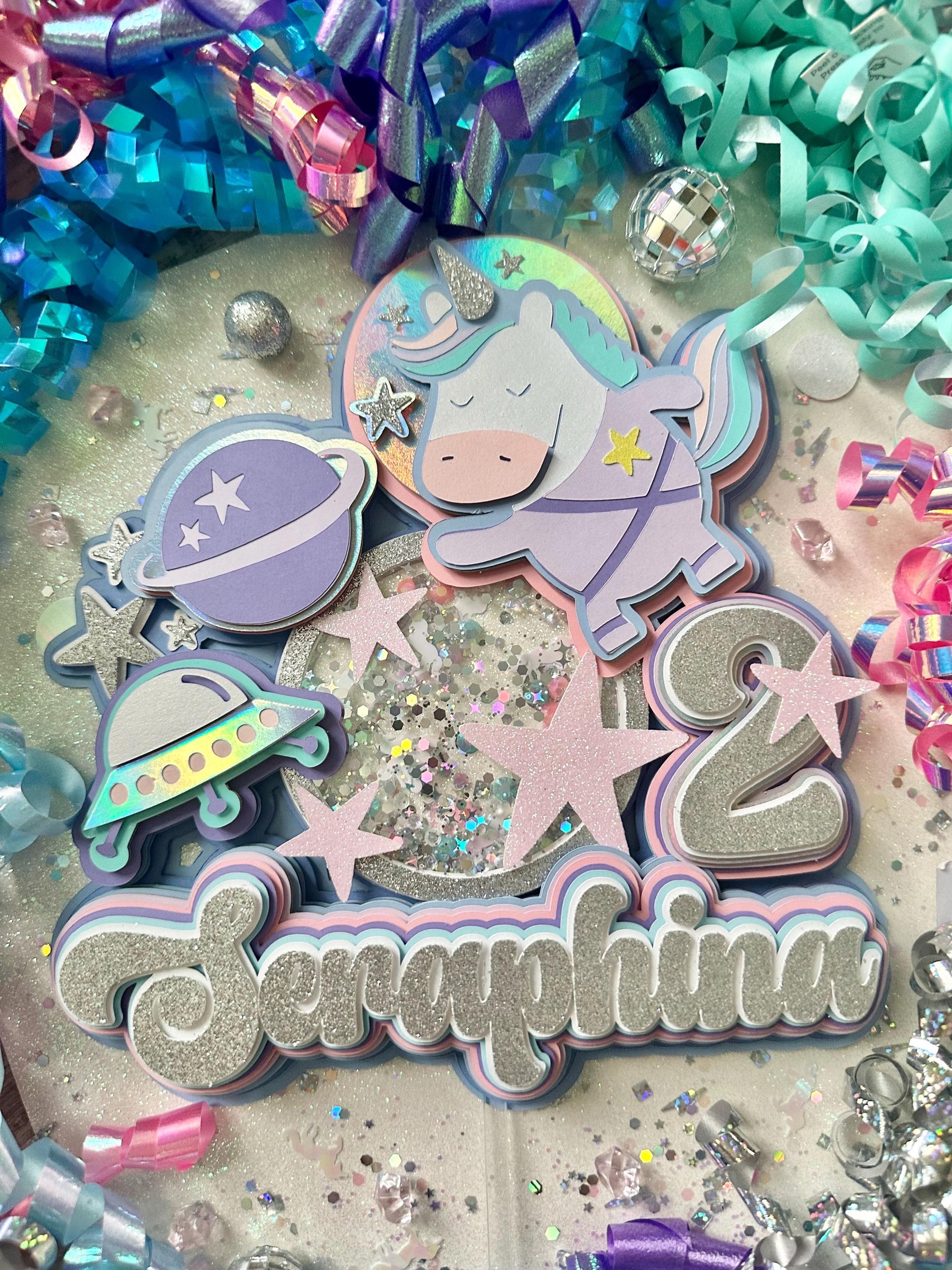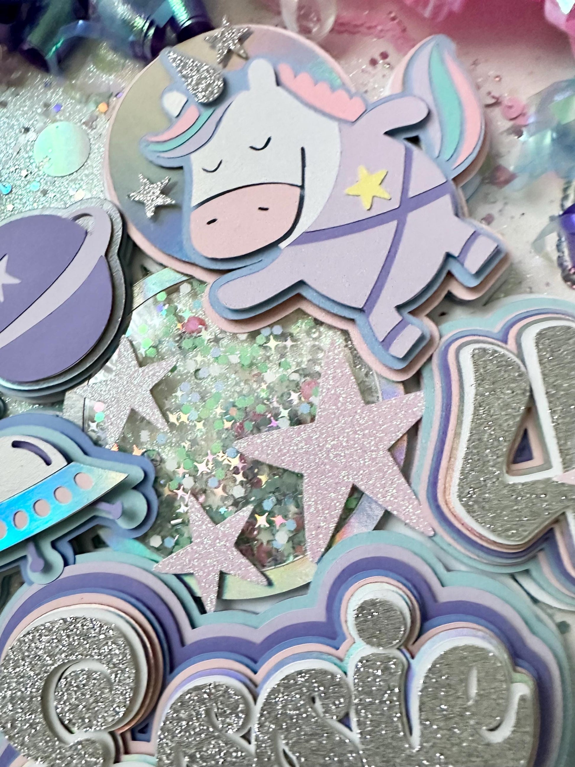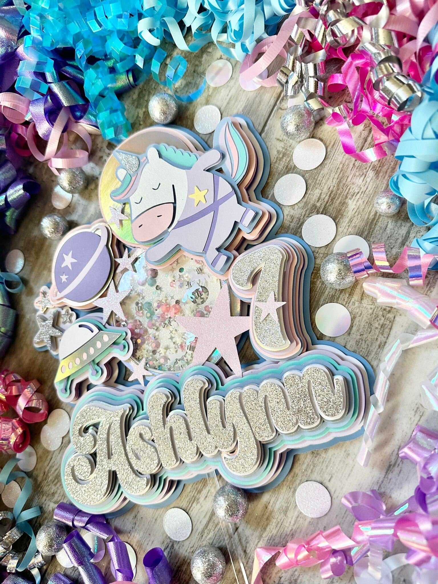 Space Unicorns Outer space Galaxy Out of This World Theme Birthday Glitter Shaker Cake Topper